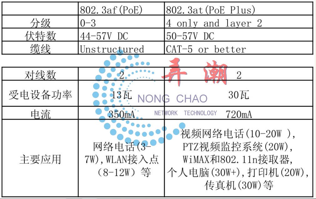 3 、IEEE802.3af与IEEE802.3at的对比: